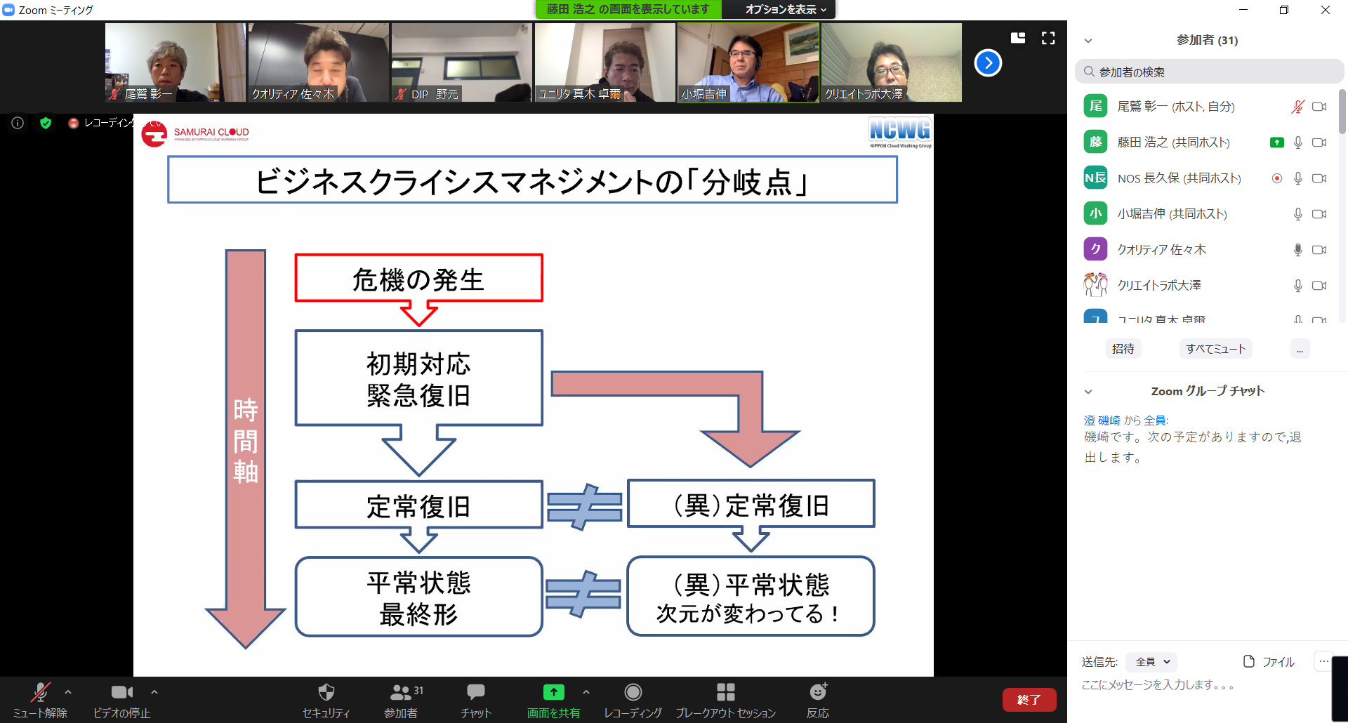 本日の会合のテーマですが、『ビジネスクライシスに対するクラウドサービスの有用性』ということで、ビジネスでの危機に対してクラウドサービスは、当然ですが有用性があるということで、この時期だからこそ再確認をする意味合いもあり、このテーマで会合を行うこととしました。