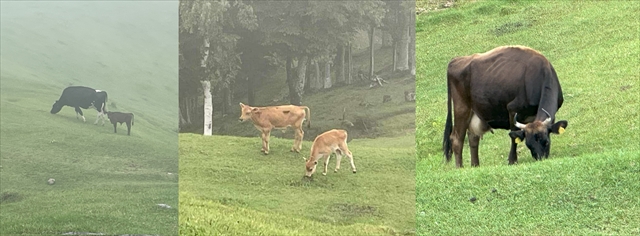 標高700m~800m程度に位置する広大な牧場は、夏でも薄着だと少し肌寒く、見晴らしが良かったと思えばあっという間に霧に包まれ10m先も見えなる環境でしたが、牛にとってはこれが快適であり、食事となる野草は牛の糞から栄養を貰って育ちながら土に根を張ることで土砂流出も防ぐという循環的な環境でした。